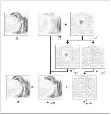 와 그 흐름에서 변동 성분 u'을 분리, 또한 그 변동 성분에는 사이클 간 변동에 기초하는 거시적인 변동 u'ccv와 난류 거동에 기초하는 미시적이 변동 u'turb가 혼재하고 있기 때문에 그 분리를 한다. 주류 흐름