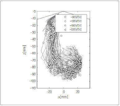 앞에서 말한 처리 과정 모습은 그림 6과 같다. 이 거시적인 변동을 함유한 속도 분포 ubulk로부터 사이클 간 변동에 대한 흥미 깊은 모습이 보이게 된다. 그 예로서 그림 7은 크랭크마다 얻어진 속도 분포에 대해 대규모 유체 회전 구조의 중심(즉 텀블 회전류의 중심)을 동정, 각 사이클마다 그 중심 위치의 궤적을 그린 것이다. 또한, 중심 위치의 동정에는 Graftieaux 등의 수법을 채용하고 있다. 이 궤적을 보면, 텀블 회전류의 중심은 압축 행정에서 사이클마다 크게 흐트러진 경로를 더듬어 가는 모습을 확인할 수 있다.