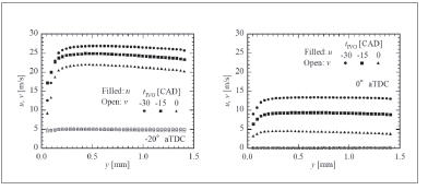 그림 10은 크랭크 각도 -20°aTDC의 피스톤 바로 위에서 μPIV에 의해 얻어진 사이클 평균 속도 분포이고, 그림 11은 피스톤 벽면에서 수직 방향에 대한 속도 성분 분포를 나타내고 있다. 또한, 그림 11 중에는 흡기 밸브의 오픈 타이밍이 다른 3종류의 데이터를 나타내고 있다. 이들 그림으로부터 엔진 운전 중의 피스톤 벽면 위쪽으로 형성되어 있는 0.4mm 정도의 매우 얇은 경계층을 파악하고 있는 모습을 알 수 있다.