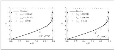 또한, 그림 12는 이들 측정된 피스톤 벽면 수직 방향에 대한 속도 분포를, 층류 경계층의 이론해(블라시우스해)와 비교한 결과를 나타내고 있다. 이 그림을 보면, 피스톤 상면의 경계층 속도 분포는 블라시우스해에 가까운 형태를 나타내고 있으며, 경계층은 충분히 발달한 난류 경계층 상태까지는 이르지 않는 것이 시사된다. 기존 엔진 연구의 대부분은 통내 유동은 매우 강한 흐름을 형성하고 있는 것으로부터, 벽면 근방의 경계층은 충분히 발달한 난류 경계층이라는 인식·선입견이 있어 그 발달된 난류 경계층 이론에 기초해 제안된 벽면상 전열 모델이 엔진 시뮬레이션 등에서 빈번하게 이용되고 있다. 그러나 이번 측정 결과는 그 개념 자체를 덮을 가능성을 시사하고 있으며, 기존 모델로는 통내 벽면의 냉각 손실을 충분히 예상할 수 없는 가능성을 시사하고 있다.