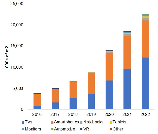 2019년 이후 디스플레이 시장은 “폴더블 OLED 디스플레이 및 대화면 OLED기술”이 적용된 TV시장이 이끌어 갈 전망이다. 최근 디스플레이 전문 조사/컨설팅 기관인 DSCC(Display Supply Chain Consultants)의 발표에 따르면, OLED는 면적 기준으로 연평균 35%의 급성장을 보일 전망이며 OLED TV는 2020년에 스마트폰을 앞설 전망이다. 대수 기준으로도 연평균 18% 성장으로 폴더블/플렉서블 디스플레이는 2021년 리지드 OLED를 대수기준으로 앞설 전망이다.