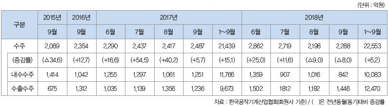 2018년 9월 공작기계 시장은 수주, 생산·출하가 증가했고, 수출은 감소했다. 내수 수주의 경우 전반적인 시장 위축, 추석연휴로 인한 조업일수 감소의 영향으로 감소세이며, 수출 수주는 미주 및 유럽 경기 호조 지속의 영향으로 반등했다.