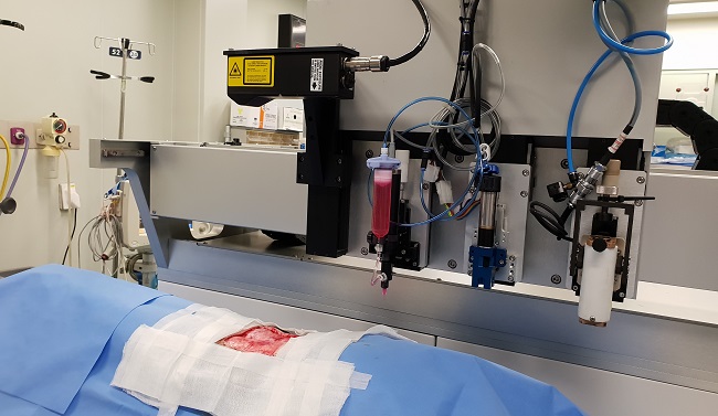 3D 바이오프린팅 장비는 환부의 위치, 크기, 깊이 등을 파악할 수 있는 스캐너와 환부에 직접 세포와 바이오 잉크를 프린팅 할 수 있는 디스펜서가 장착돼 있다. 또 환부에 위치, 크기, 깊이 등을 파악하여 프린팅 할 영역을 자동으로 계산하는 소프트웨어가 구축돼 있다. 특히 이 공정·장비는 곡면 프린팅이 가능해 손상된 피부 표면을 그대로 프린팅 할 수 있다.