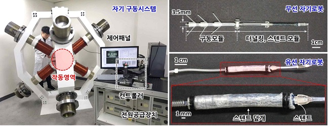 이번 기술에는 자기 구동시스템의 설계 및 자기장 제어기술이 적용돼 기존 자기 구동시스템 대비 약 3배의 자기장 세기 증가가 가능한 고출력 자기장 생성이 가능하다. 또 혈관 환경 내 조향 및 이동을 위한 운동 제어기술은 혈관의 직경 변화 및 맥동류 등의 외란 속에서도 안정적으로 구동하는 무선 기술이다.