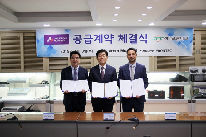 ▲왼쪽부터 한국 알스트롬뭉쇼 박원길 대표이사, 상아프론테크 이상원 대표이사, 알스트롬뭉쇼 Giuseppe Costa 부사장