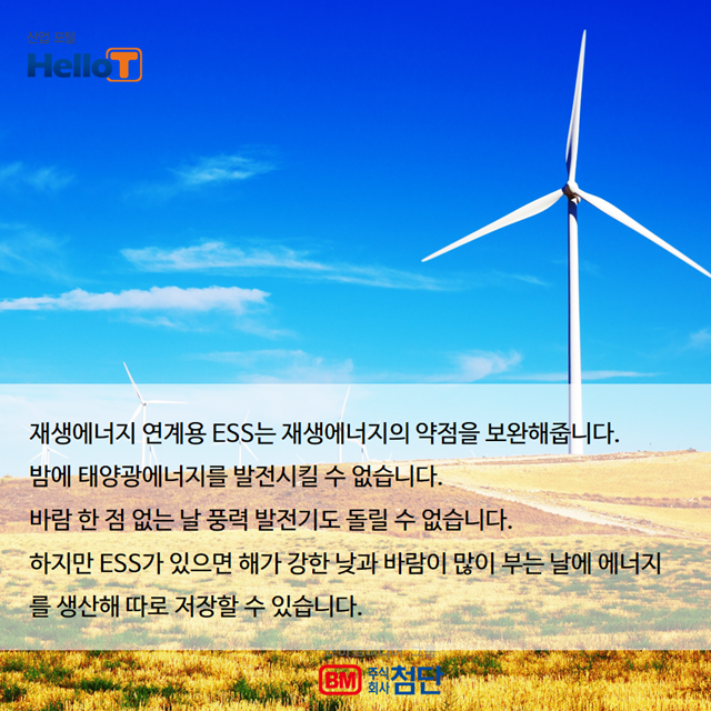 하지만 ESS가 있으면 해가 강한 낮과 바람이 많이 부는 날에 에너지를 생산해 따로 저장할 수 있습니다.