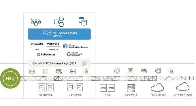 VMware NSX 서비스 메쉬(Service Mesh_는 이스티오(Istio) 서비스 메시 기술을 확장해, 애플리케이션 레이어에서 마이크로서비스, 데이터, 사용자, 기존 모놀리식(monolithic) 애플리케이션 등에 대한 가시성, 제어, 보안을 제공한다. 또 VMware NSX-T Data Center 플랫폼의 네트워크 및 보안 복제 서비스로서 역할을 하며, 컨테이너 네트워크 인터페이스(Container Network Interface, CNI)를 통해 컨테이너에 적용이 가능하다.