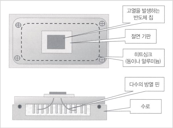 그림 1에 ‘핀핀형 히트싱크’의 냉각 이미지를 나타냈다. 돌출된 다수의 핀이 냉각수에 잠겨 있는 히트싱크를 핀핀형 히트싱크라고 한다. 핀핀형 히트싱크는 직접 수냉형의 인버터 등에서는 매우 일반적으로 채용되는 형상의 것이다. 또한 최근에는 자동차의 전조등에 대한 LED 램프 채용이 추진, 여기에 사용되는 LED 칩에도 고효율 방열 핀이 필요하다.