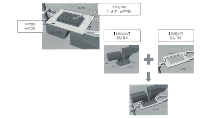 그림 7에 시제작한 핀핀형의 히트싱크와 각각의 용탕 유로를 나타냈다. 동 그림의 중심부가 히트싱크부의 고열전도 알루미늄, 주변의 프레임워크가 ADC12이다. 이번 개발에서는 프레임부를 먼저, 히트싱크부를 나중에 주입한 것이 포인트이다.
