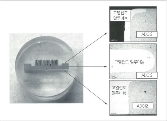 따라서 ADC12를 먼저, 순알루미늄에 가까운 고열전도 알루미늄을 나중에 사출함으로써 먼저 사출한 ADC12의 표층을 재용융시킬 수 있다. 그림 6의 오른쪽 측에 양호하게 결합된 상태를 확인할 수 있다.