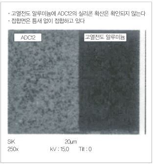그림 9는 동일한 경계면을 주사형 전자현미경으로 관찰한 사진이다. 고열전도 알루미늄 ADC12가 확산하지 않고 있으며, 2개의 경계면에도 틈새는 없다.