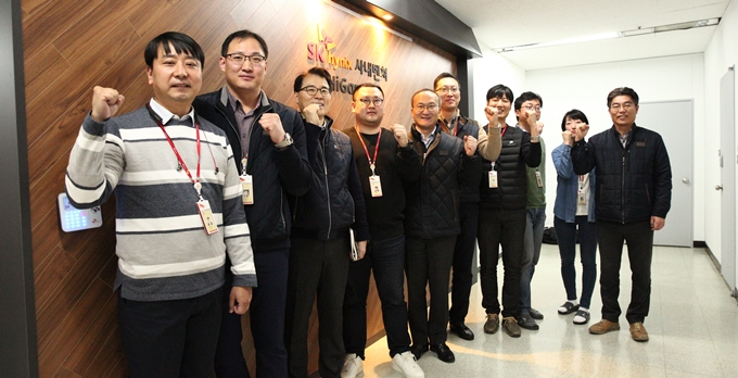 ▲ SK하이닉스 사내벤처 하이개라지(HiGarage) 출범식에서 이석희 SK하이닉스 대표이사(왼쪽에서 다섯 번째)와 사내벤처 주인공들이 기념촬영을 하고 있다.