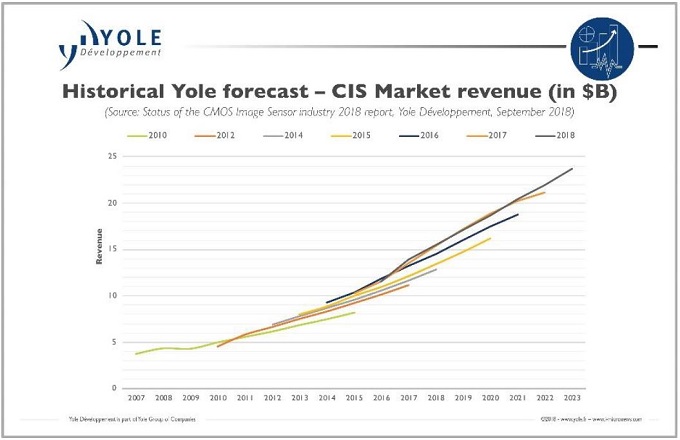 시장 조사 및 전략 컨설팅 회사인 Yole Développement의 ‘CMOS 이미지 센서 산업의 현황’이라는 새로운 보고서는 CMOS 이미지 센서(CIS)의 미래를 낙관하고 있다. 2017년 CIS 시장은 139억 달러로 집계됐다. 보고서는 이 시장이 2023년까지 총 시장 가치 230억 달러에 이를 것으로 예측했다.