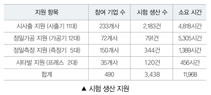 지난 2018년, 한국금형센터는 시험 생산을 지원하는데 주력했다. 센터는 초정밀 시험 생산 장비를 활용해 수도권 금형업체의 고부가가치 금형개발을 지원함으로써 국내 금형산업 경쟁력 강화에 기여했다. 총 490개사가 참여해 3,438건의 시험 생산이 진행됐고 소요 시간은 11,968시간이었다. 상세 내용을 살펴보면 다음과 같다.
