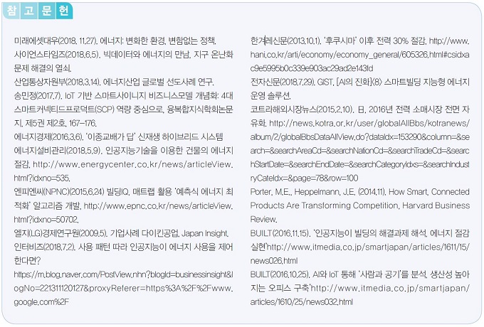 그림 5에서 보듯이, 빌딩IQ는 전력계, 온도계, HVAC 센서 등에서 수집된 각종 데이터와 날씨 데이터, 요금제 데이터, 건물 특성 데이터 등 방대한 데이터를 분석하는 PEO와 HVAC 제어 서비스를 현재 제공 중이다. 최적화를 위한 PEO는 건물에 최적화된 에너지 사용 방식을 예측해 HVAC 에너지 비용을 최소화하게 도와주며, 제어를 위한 AI 기반 HVAC 제어시스템은 수천 회 시뮬레이션을 실행한 이후 12시간 동안 가장 효율적이라 판단되는 HVAC 운영 전략을 실행한다. 예로 가스, 전기, 증기, 태양열 등 다양한 에너지원을 사용하는 건물의 경우에 각각의 요금제까지 고려해 운영비용을 가장 절감하게 하는 운전 방법을 선택한다. PEO에 대해서는 다음 호에서 다시 언급하기로 한다.