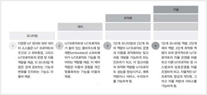 2019년에 들어서면서 필자는 에너지 데이터 수집과 공유, 활용에 더 초점을 두고 에너지산업 비즈니스모델의 확장 가능성들을 탐색하기 시작했으며, 에너지의 생산, 거래, 소비 영역 중에서 먼저 소비 효율 부문의 비즈니스모델 사례들을 발굴하고자 한다. 이의 기반이 되는 논거는 그림 1에서 보듯이, 하버드비즈니스리뷰 논문에서 제시된‘스마트 커넥티드 프로덕트(Smart, Connected Products; 이하 SCP)’의 4대 역량이다.