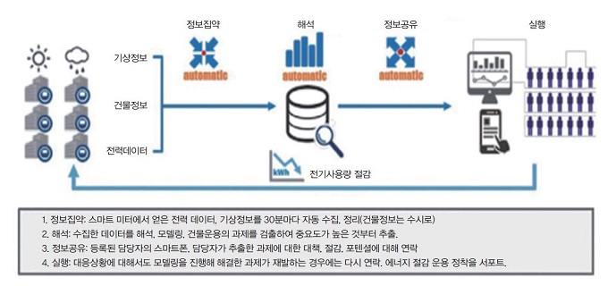 그림 3에서 보듯이, 에넷에 수집된 데이터는 고속, 대용량 처리 분석은 물론이고, AI가 24시간 내내 빌딩의 에너지 운용 과제와 에너지 절약 대책을 스스로 보고하며, 관련 데이터를 관리자에게 통보한다. 2017년 말에 개발된 ‘에넷아이(Ennet Eye)’는 모든 빌딩을 원격으로 분석 및 제어하며, 이상 징후가 나타나면 AI가 언제든지 고객에게 통보한다. 다시 말해, AI 엔진을 이용해 현황 모니터링 수준에 머물지 않고, 전기요금 절감 대책을 알려주는 것이 이 솔루션의 장점이다. 에넷은 이를 통해 최대 5~10%의 에너지 절약이 가능한 것으로 추산하고 있는데, 데이터 분석이 30분 간격으로 반복되므로 야간이나 휴일 등 어려운 시간대에도 문제점을 발견하고 조치할 수 있게 한다.