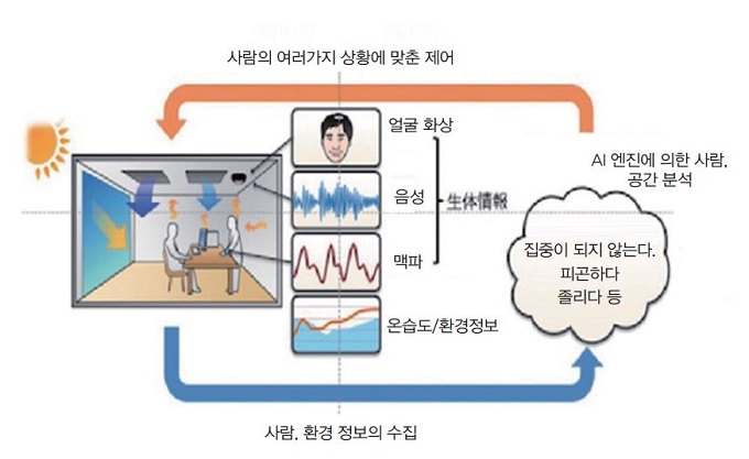 그림 4에서 보듯이, 공간 사용량 모니터링 데이터에 따라 NEC의 AI 기반으로 실내 온도와 습도를 예측하며, 그 결과를 근거로 공조 시스템이나 조명 및 기타 사무실 설비를 자동 제어하게 한다. 또한, 혈압, 심박수 등 각 사람의 생체 데이터도 수집하여 습도, 조도와의 상관관계를 밝히고, 각 사람의 업무 내용과 심신 상태에 적합한 환경을 구성하고 지능화된 공기 및 공간을 조성하게 한다. 다이킨공업과 NEC는 실증작업을 통해 상용화를 목표로 한다. 또한, 다이킨공업은 구글과도 협력해 구글의 AI 기반 온도조절기인 네스트를 라인업에 편입시켰고, 인텔과도 협력해 태블릿 기반의 모바일 관리 서비스를 제공 중이다.
