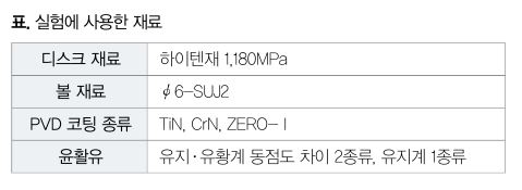 시험 초기에는 ZERO-Ⅰ의 마찰계수가 가장 낮고, 이어서 논코트, CrN, TiN의 순이 됐다. 오일 윤활에서는 시험 초기에서부터 경계 윤활로 접동이 이루어지기 때문에 하이텐재와 피막, 유활유의 마찰마모 특성의 결과를 얻을 수 있었다.