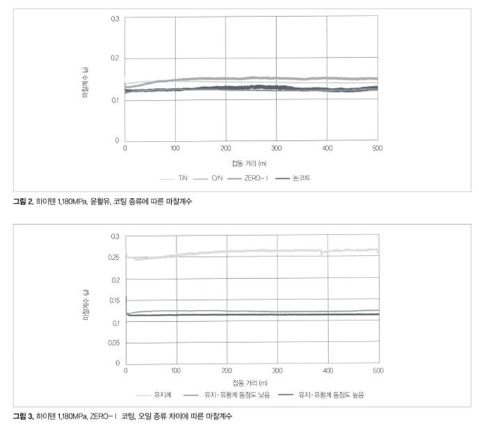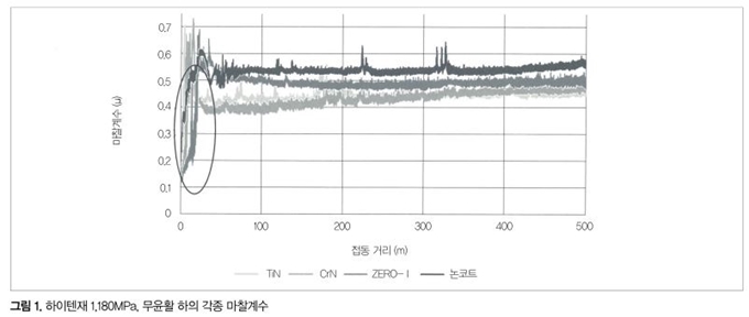 그림 2에 하이텐 1,180MPa, 윤활유, 코팅 종류에 따른 마찰계수 그래프를 나타냈다. 윤활 하에서는 모든 종류에서 마찰계수가 크게 내려가고, 500m 접동해도 안정되어 있다.