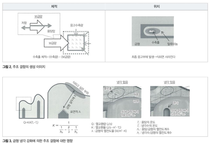 다이캐스트 부품의 내부 결함에는 크게 나눠 충전 시의 권입에 의한 결함(가스홀․초기 응고편 등)과 응고 수축에 의한 결함(수축홀)이 있다. 특히 후자는 그림 2로부터도 알 수 있듯이 그 위치와 크기를 결정하는 인자로서 용탕의 응고 거동이 중요해진다.