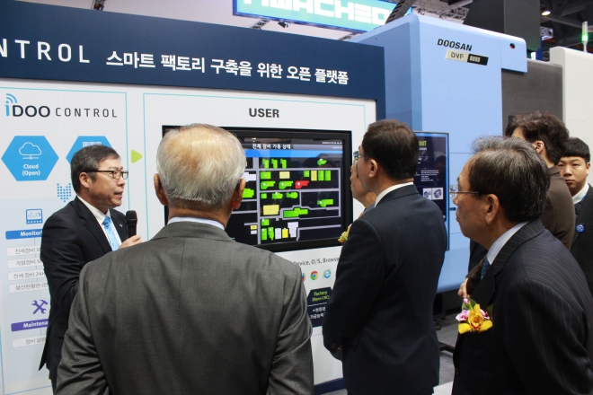 ▲VIP 인사들이 화천기계 부스에서 머시닝센터에 대한 소개를 듣고 있다.