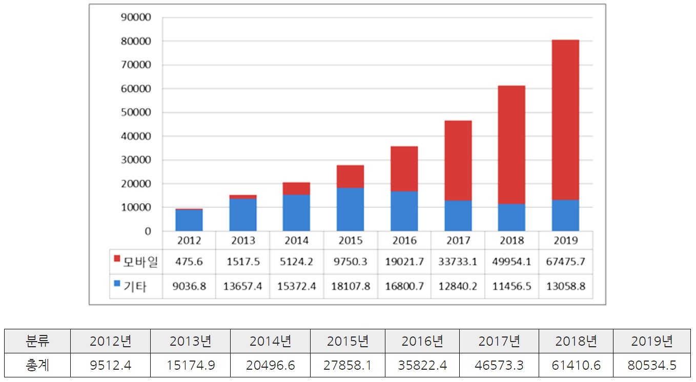 주요 생활소비재에 속하는 식품 및 음료 그리고 의류 및 신발의 거래 규모가 빠른 속도로 증가하고 있으며 유로모니터는 2019년에 해당 품목의 거래 규모가 2015년에 비해 약 3배 가까이 성장할 것으로 전망하고 있다(표 2).