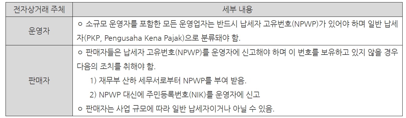 NPWP 및 인도네시아 신분증 상의 NIK번호를 보유하지 않는 인도네시아 비거주 국외 판매자의 경우 거래하는 전자상거래 플랫폼에 어떠한 신분 정보를 입력해야 하는지도 정해지지 않은 상황이다.