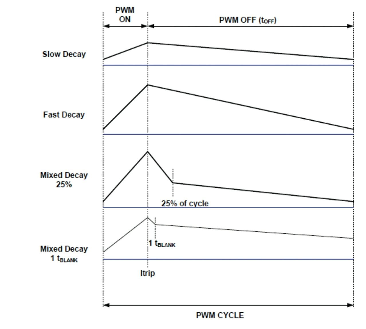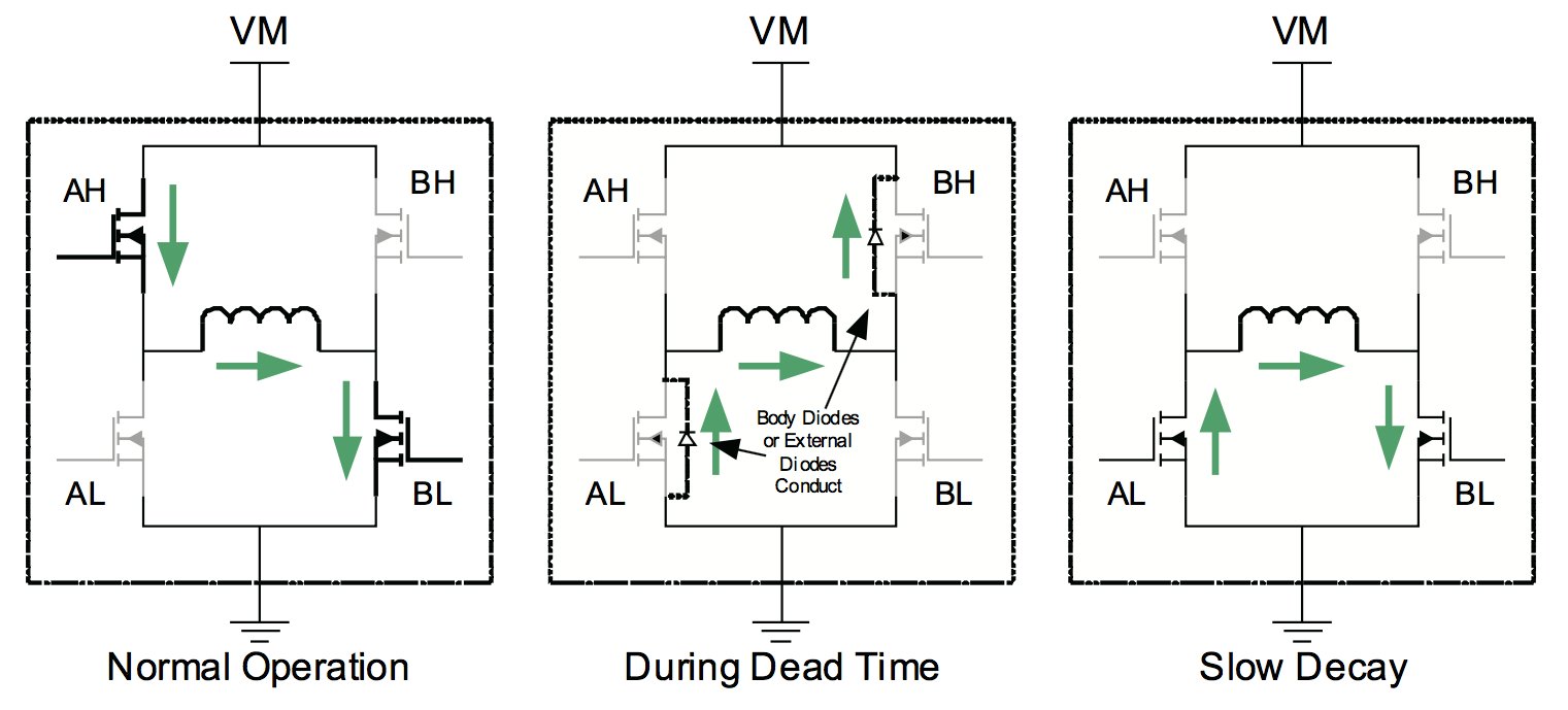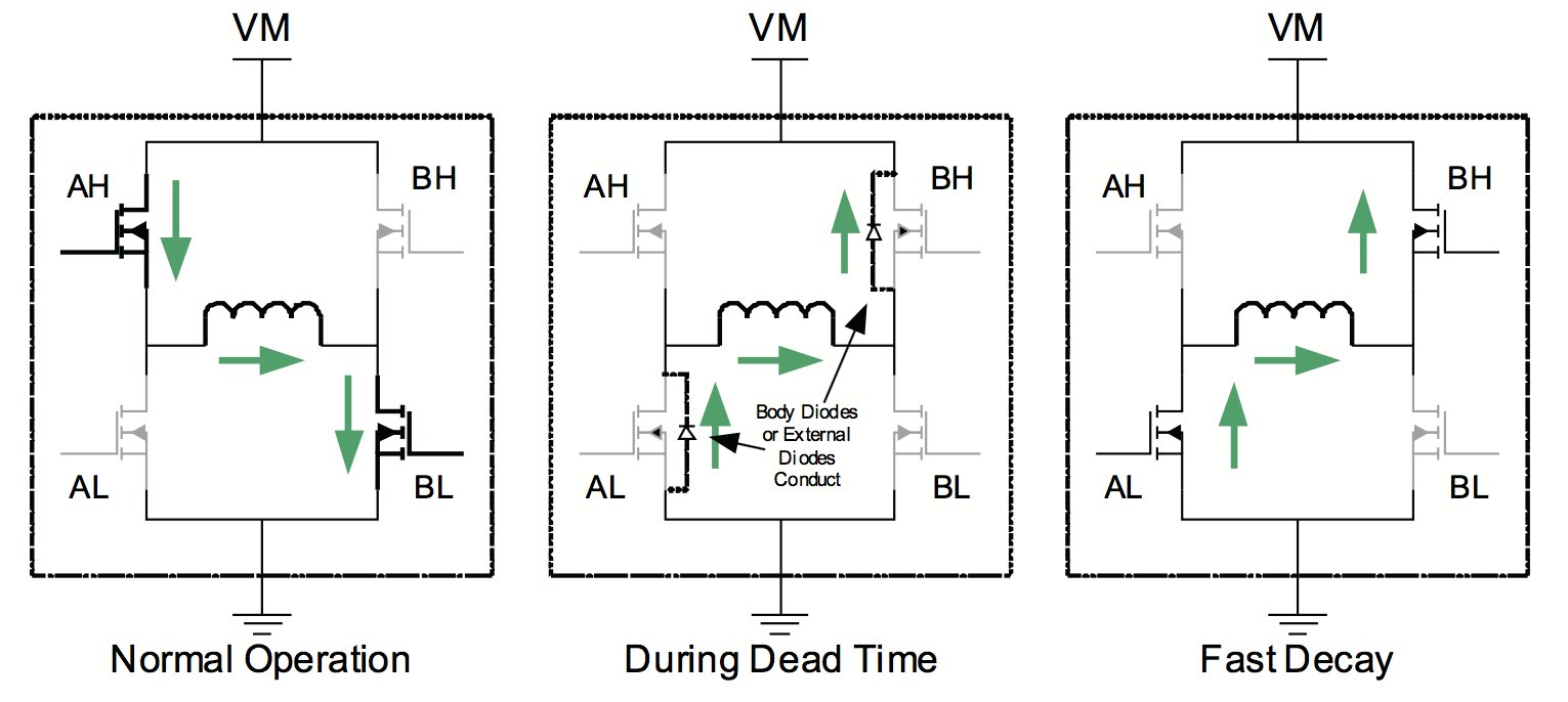 느린 감쇠일 때는 양쪽 하측 전력 트랜지스터를 통해서 전류가 재순환된다. 느린 감쇠일 때 문제점은, 모터를 구동하기 위해서 필요한 전류 양을 제한할 수 있다는 것이다. 빠른 감쇠는 H 브리지를 통해서 코일 권선 전압이 거꾸로 흐르게 해서 전류를 빠르게 떨어트린다. 하지만 대신에 높은 리플 전류를 일으킴으로써 효율을 떨어트릴 수 있으며 해당 모터로 높은 전류 레벨을 필요로 하는 경우에는 적합하지 않을 수 있다.