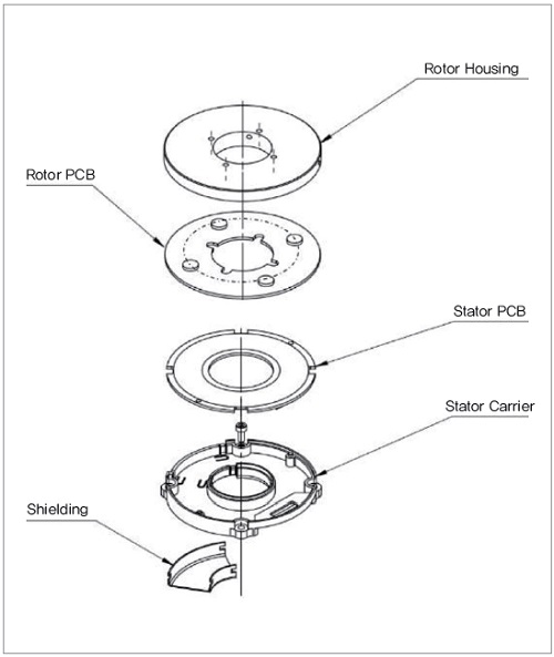 결과적으로 스테이터와 로터에 서로 다른 원주 주파수를 가진 두 개의 정전용량 밴드가 형성되며, 신호처리시스템은 이들로 부터 얻어진 신호값을 분석하여 360° 전 영역에서 로터의 위치를 정확히 결정할 수 있다.