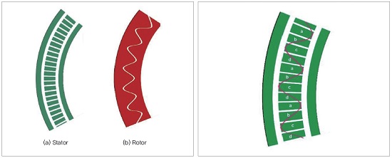 스테이터와 로터 표면이 중첩되어 반복되는 패턴이 원주방향으로 형성되어 있다. 로터의 위치에 관계없이 스테이터에 “a”로 표시된 세그멘트는 로터의 영역으로부터 동일한 중첩도와 내측 및 외측 링으로부터 동일한 수준의 정전 용량 커플링을 가지게 된다. 이와 같은 과정이 “b”, “c”, “d” 영역에도 동일하게 적용된다. 이와 같이 각 세그멘트를 평행하게 연결하는 반복적인 패턴 디자인에 의하여 네 그룹의 중첩되는 커패시터 시스템을 형성하고 각 그룹은 디스크의 전체 원주 방향에 배치된다.