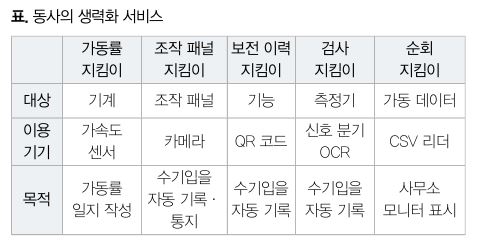 이러한 경험에서 가공현장의 작업 기록을 전자화하지 않으면 현장의 작업이 증가해, 생산성 향상을 위한 서비스가 본말전도가 된다고 생각하기 시작했다. 현장의 세밀한 수기입을 없애는 편이 전조 검지보다 지금은 중요하지 않을까 해서 시작한 것이 생력화 서비스의 '가동률 지킴이', '조작 패널 지킴이', '보전 이력 지킴이', '검사 지킴이', '순회 지킴이'이다(표).