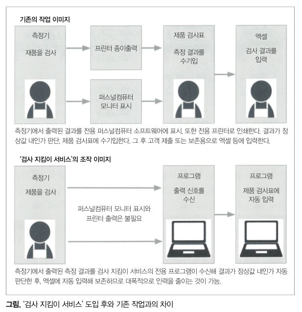 순회 지킴이는 현장을 돌면서 기계 가동 상황을 기록하는 작업 대신에 신호를 취득해 자동으로 사무소 모니터에 표시하는 서비스이다. 검사 지킴이는 투영기나 검사기 등에서 프린터나 모니터에 출력되는 측정값을 검사표에 수기입하지 않고 출력 케이블을 분기시켜 신호를 복제해 기록하는 서비스이다(그림).