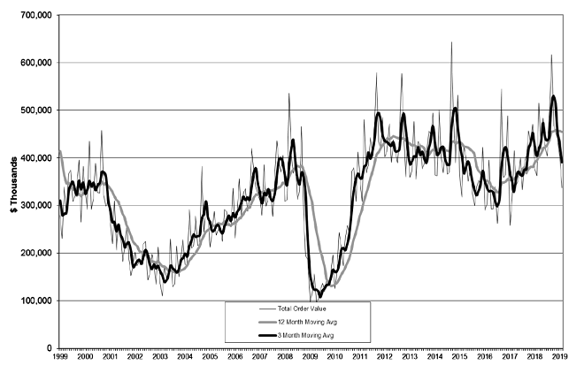 ▼2019년 2월 미국 공작기계 수주 현황 (Total U.S. Manufacturing Technology Orders Through February 2019)