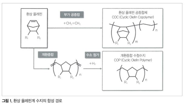 환상 올레핀계 수지는 그 화학 구조로부터 환상 올레핀 공중합체(COC)와 개환중합 수첨수지(COP)로 분류된다. 이들의 합성 경로를 그림 1에 나타냈다. COC는 모노머로서 이용하는 환상 올레핀과 α-올레핀을 부가 공중합함으로써 합성된다.