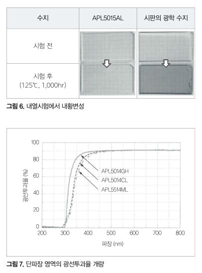 잘 황변하지 않는다는 것은 렌즈 외관의 변화가 작은 것을 의미할 뿐만 아니라, 피사체의 색깔을 보다 정확하게 식별하는 성능이 우수하다는 것으로 이어진다. 그렇기 때문에 장기 내열시험은 렌즈 메이커나 카메라 메이커에서 매우 중시되고 있다. APL5015AL은 차재 카메라 렌즈를 비롯해 헤드업 디스플레이용 부재 등의 용도로 평가 개발이 적극적으로 추진되고 있다.