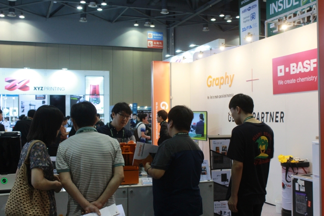 이번 전시회에서 참가한 3D프린팅 소재 개발 기업 그래피(Graphy)는 자사가 개발한 소재인 S-Plastic과 Tera Harz를 선보였다. S-Plastic은 국내 최대 3D프린터 관련 화학회사의 원료를 엄선하고, 3D프린터 사용자의 요구를 반영해 개발된 고기능성 광경화성 소재다.
