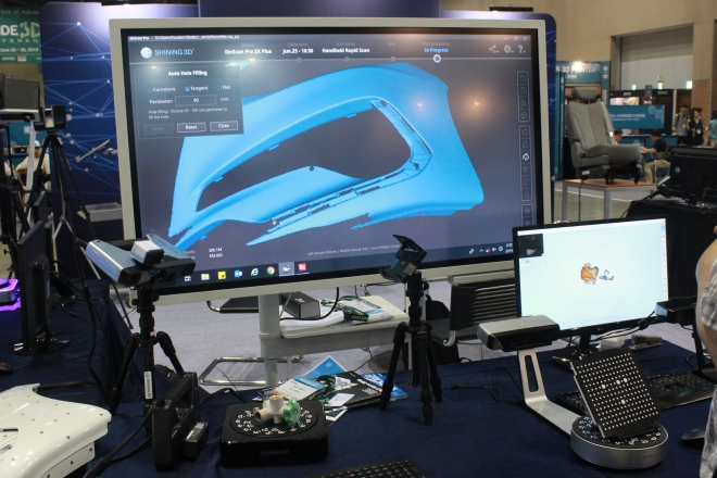 Hustem은 3D스캐너 전시를 비롯해 소프트웨어와 함께 장비가 구현되는 모습을 전시했다. 3D스캔 데이터 기반 소프트웨어는 3D스캐너에서 스캔한 데이터로 점토 모델링, 제품 설계, 품질 검사를 진행한다.