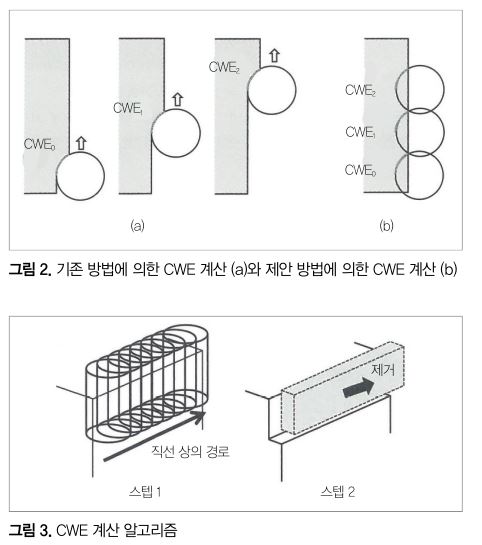 제안 방법의 CWE 계산의 알고리즘을 이하에 나타냈다(그림 3). 공구경로의 직선 부분마다 이하의 처리를 반복한다.