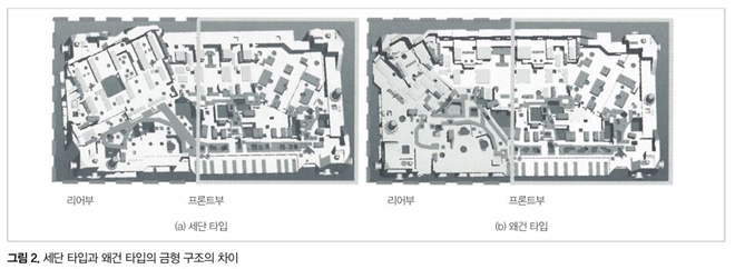 그림 2에 과거에 제작한 베이스차(세단)와 파생 차종(왜건)의 프레스 금형을 나타냈다. 금형 구조를 비교하면 프론트부는 거의 동일한데, 리어부는 전혀 다른 가공 부위와 조금 위치가 어긋난 만큼의 가공 부위가 혼재하고 있다.