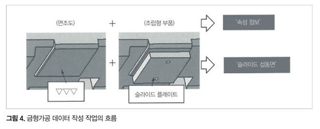 위의 ①, ②의 케이스에 대해서는 금형 어셈블리 데이터가 있으면 금형 구조 기능을 유추하는 것이 가능하다. 그래서 금형 어셈블리 데이터의 가공 부위에 접촉해 있는 금형 부품(조립형 부품)을 검색, 그 조립형 부품의 이름과 가공 부위의 면조도를 키로 해서 금형 구조 기능을 자동 인식하고 가공 부위에 속성 정보를 자동 부여하는 방법을 고안했다(그림 4).