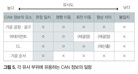 그것을 정리한 표를 그림 5에 나타냈다. 그러나 예를 들면 유사도가 완전 일치해도 주변의 형상이 다르면, 가공 개시 위치에 대한 접근 동작 등으로 간섭하는 케이스가 있다. 그래서 유용하는 가공 공정에 대해서는 모두 간섭 체크를 해 보증하기로 했다.