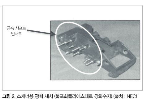 스캐너용 광학 섀시를 그림 2에 나타냈다. 이 부품의 특징은 기존 알루미늄 부품에서 확보하고 있던 판독 데이터의 고정도화를 담보하는 동심도, 원통도, 치수 정도를 수지의 사용, 금속 샤프트의 고정도 인서트 성형으로 실현, 생산성도 향상시킨 것이다. 사용 수지는 열경화성수지인 불포화폴리에스테르 강화수지의 수축률을 거의 제로로 개선한 재료이다. 성형에는 트랜스퍼 성형을 이용한 사례이다.