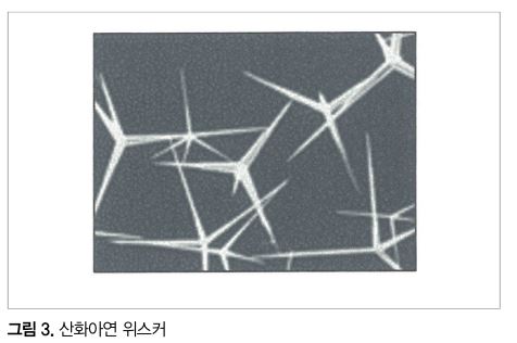 부품의 적은 휨, 수축의 이방성 완화를 창출하는 첨가물로서 산화아연 위스커가 있다. 결정 구조를 그림 3에 나타냈다. 산화아연 위스커를 PPS, LCP 등의 수지에 첨가해 사용함으로써 그림 4의 광픽업, 그림 5의 정밀 기어, 그림 6의 DVD 렌즈 홀더의 제작을 가능하게 했다.