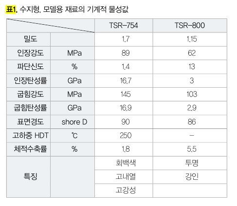 캐비티, 코어에 사용한 자외선경화수지(TSR-754)의 기계적 물성 및 모델용 수지의 기계적 물성값(TSR-800)을 표 1에 나타냈다. 수지형용 수지는 모델용 수지와 비교해 명확하게 인장탄성률, 굽힘강도, 굽힘탄성률이 크고, 극소량 생산용 캐비티, 코어에 적합한 것을 확인할 수 있다. 이 사례에서는 생산 수 200개의 요구에 대해, 코스트 다운 효과는 양산 금형(강재) 대비 40% 절감, 리드타임은 양산 금형(강재) 대비 30% 단축을 실현했다.