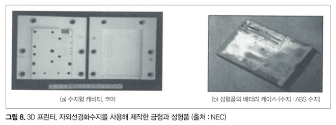 3D 프린터, 자외선경화수지를 사용해 제작한 캐비티, 코어를 그림 8 (a)에 나타냈다. 또한 이 캐비티, 코어를 사용해 성형한 배터리 케이스를 그림 8 (b)에 나타냈다.
