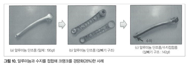 금속 부품 모두를 수지화하는 것이 이상적이지만, 수지로는 기계특성, 내열성, 도전성 등을 클리어할 수 없는 경우, 수지와 금속의 병용도 필요하다. 기존의 볼트, 접착제에 의한 고정법 이외에 NMT, TRI 등의 접합 방법에 의해 부분적으로 수지화하는 방법이 추진되고 있다. 부품에 요구되는 사양을 충분히 검토한 후에 금속을 모두 수지화할지, 부품적으로 수지화할지를 유연하게 검토하는 것도 중요하다. 한 예로서 알루미늄과 수지를 접합해 크랭크를 경량화(28%)한 사례를 그림 10에 나타냈다.