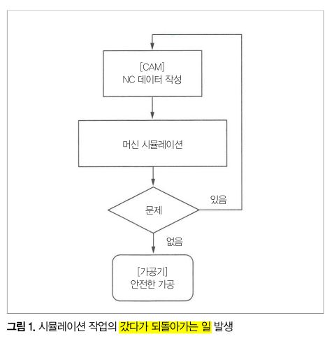 또한 가공현장에서 사용되는 NC 데이터로 변환하기 전의 CL(Cutter Location) 데이터로 확인하는 경우가 많기 때문에 NC 데이터 내의 과제를 발견할 수 없다. 더구나 시뮬레이션 연산을 하고 있을 때는 다른 CAM 연산을 할 수 없거나, 혹은 툴패스의 연산 속도가 늦어져 버리는 등 본래의 CAM 작업에 대한 영향도 걱정된다.