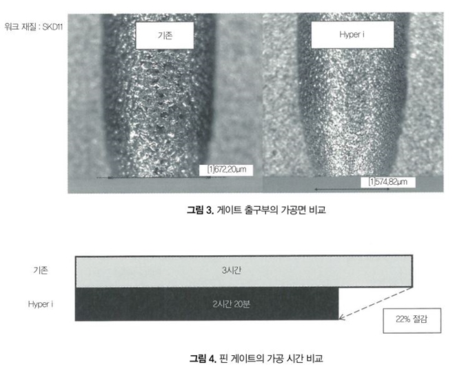 그림 3은 핀 게이트의 형상을 가공한 사례이다. 기존과 비교해 게이트 출구부의 방전면에 얼룩이 없고 다듬질이 향상되어 있으며, 또한 총가공 시간이 22% 단축되어 있다(그림 4). 기존의 프로그램에 미스가 있었던 것이 아니고, 가공 조건이나 점프 설정이 핀 게이트의 형상에 최적인 조합으로 되어 있지 않았던 것이 원인이다.