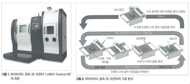 이 글에서는 Powder Bed Fusion(PBF : 분말 바닥 용융결합) 방식을 이용한 적층조형과 고속 절삭가공을 동일한 장치의 일련의 프로세스로 실현하는 하이브리드 금속 3D 프린터(그림 1)에 대해 소개하고, 복합가공의 우위성에 대해 설명한다.